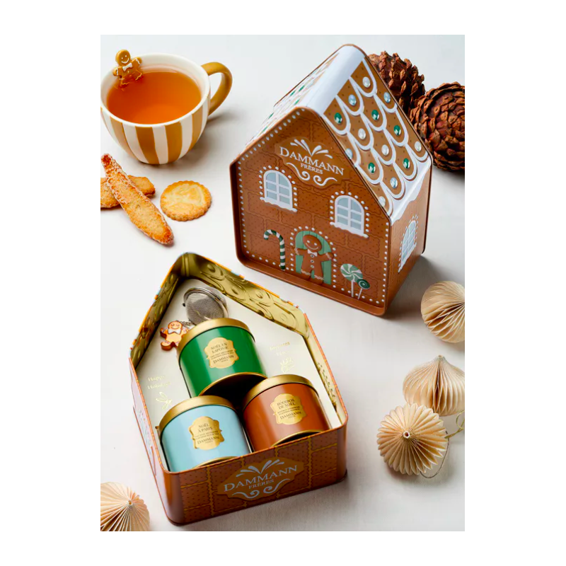 Ce charmant coffret en métal orné d'un décor de maison en pain d'épices réunit trois mélanges aromatisés aux saveurs de Noël. Il contient trois boîtes de 40 g pour deux thés et une infusion de fêtes, ainsi qu'une boule à thé fantaisie. Le petit plus : il se transformera en boîte à biscuits dans laquelle vous pourrez présenter et conserver de délicieux gâteaux de Noël faits maison !