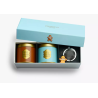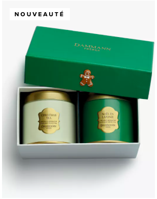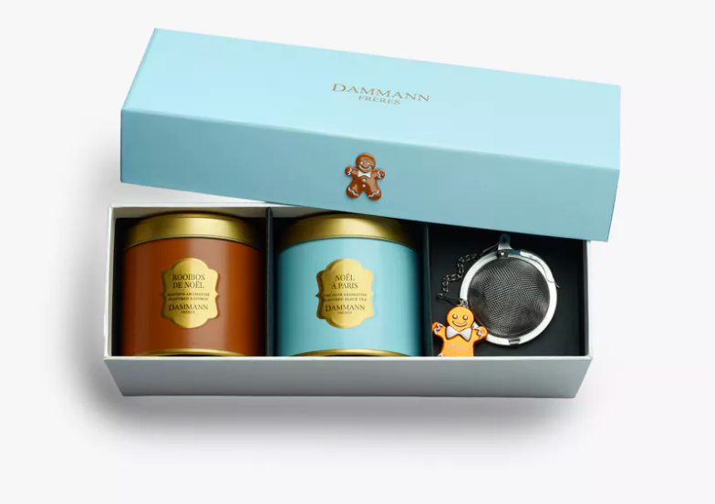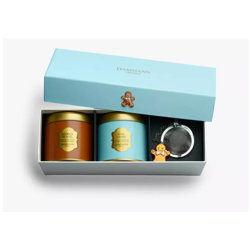 Pour un Noël festif, deux mélanges de Noël sont présentés en boîtes de 40 g, et réunies dans un coffret bleu polaire orné d'un médaillon représentant un petit bonhomme en pain d'épice. Le coffret contient notre thé Noël à Paris, un thé noir finement fruité et épicé et notre Rooibos de Noël, une infusion sans théine aux délicieuses saveurs d'épices de Noël. Ces deux mélanges sont associés à un infuseur orné d'une amusante figurine représentant un petit bonhomme en pain d'épices.